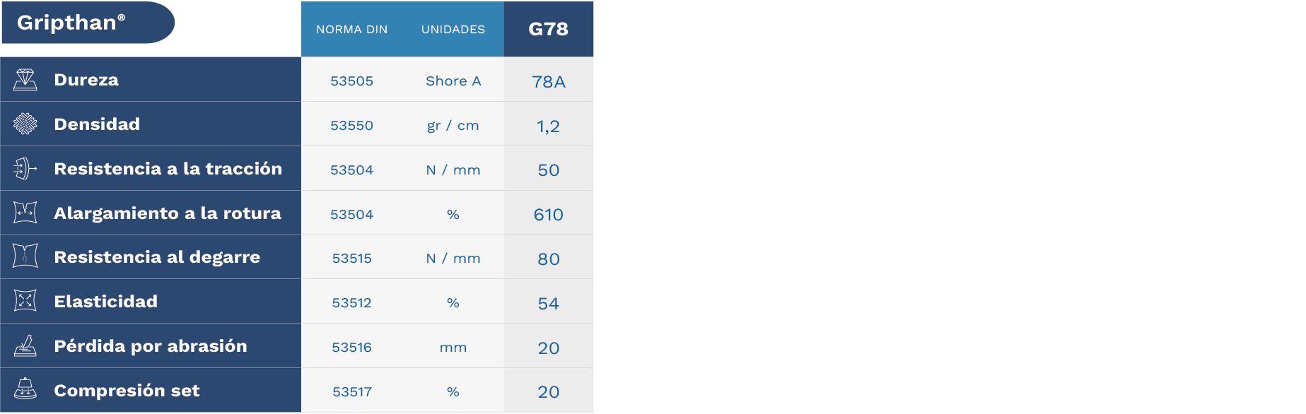 Es un poliuretano de altas características, siempre se presenta en color azul y destaca por su baja dureza de 78 Shore A, lo que le confiere una gran capacidad de agarre.